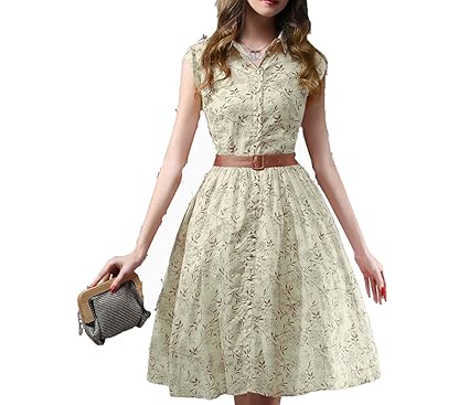 Neudas Women Casual Turn Down Collar A Line Pleated Hem Belt Dress